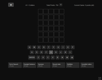 5. Hints: Part of Speech, Example, Definition, Synonym/Antonym, Scramble Letters, Reveal Letter (cost increases each use).